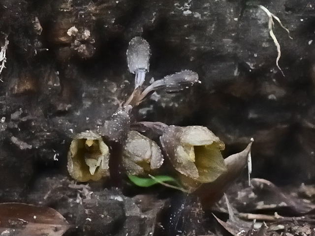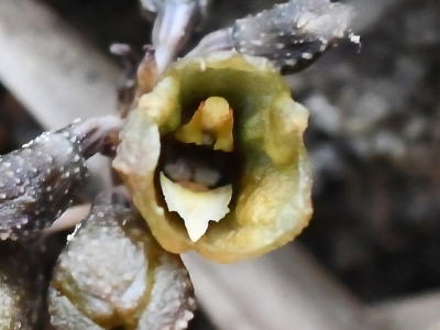 萼片は合着し筒状となり、中に淡い黄色の、唇弁とづい柱が見える。「