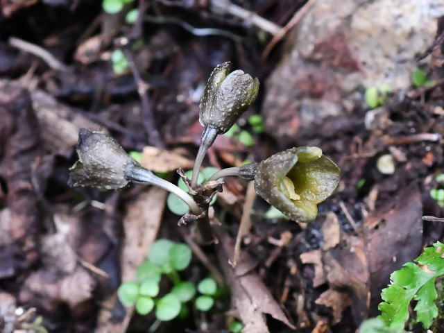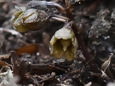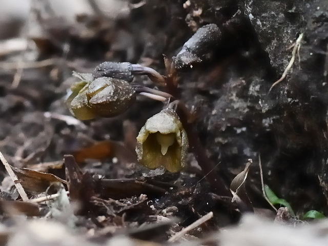 常緑樹林や竹林などに生え、高さ5センチ程度の菌従属栄養植物。