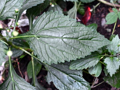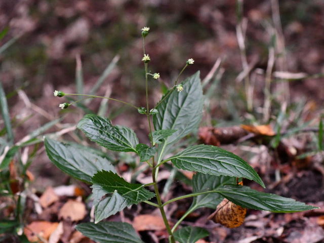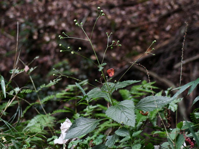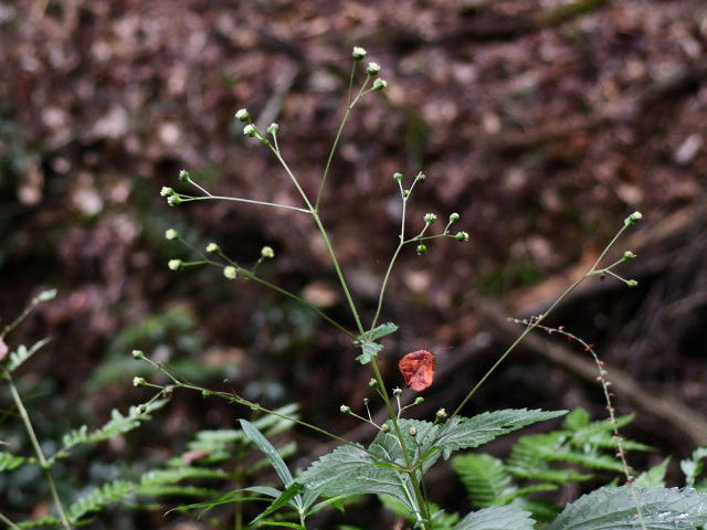 関東以西の山地の湿った林縁に生え。草丈40センチ〜1メートル程度になる多年草 花は直径1センチ弱の半球形で花冠は淡紅色の花を30個程付ける。 花柱は白色、2個の花柱は花冠から長く突き出して、良く目立つ。 葉は対生し長さ4〜20センチ、幅3〜12センチの卵形〜広卵形、不揃いの鋸歯がある 葉柄は長さ1センチ〜6センチ程で翼があり、中部の葉が大きくなる。 |