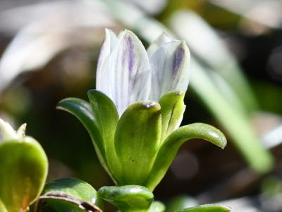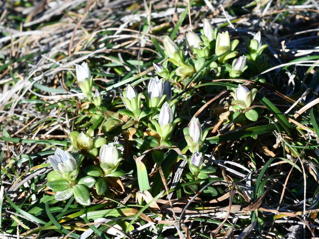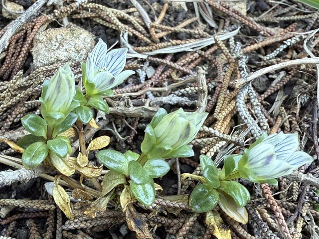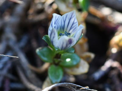 海岸の風の当たる斜面の一年草で、草丈は10センチ程度 花は白色〜淡紫色で紫色の縦脈が目立つ。 裂辺は5個、楕円形で先がとがり、長さ1.5センチ程度。 短い柄があり枝先や葉脇に一個づつ付く。 裂辺の根元には黄色い密腺が2個ある。 茎は基部より分枝株拉致となることが多い。 葉は対生しやや多肉質で、長さ1。5センチ内外のヘラ形で浅先が尖る。 |